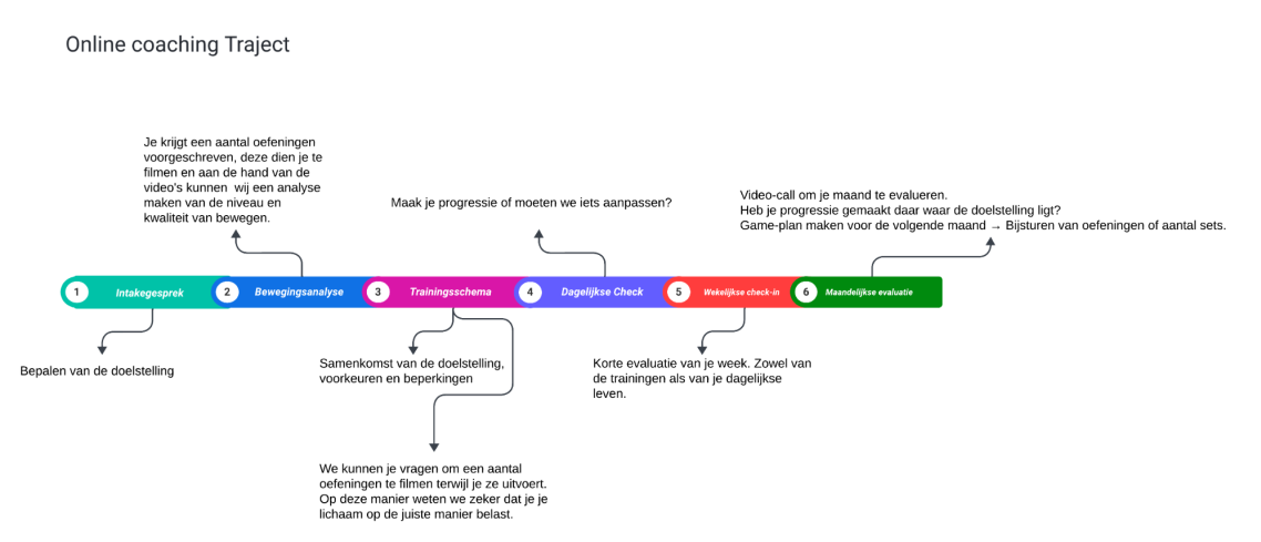 - Wekelijkse videocall waarin we eventuele probleempunten van afgelopen week bespreken, video’s samen analyseren en samen vooruit blikken op de volgende week en wat we daar verwachten en gaan doen.