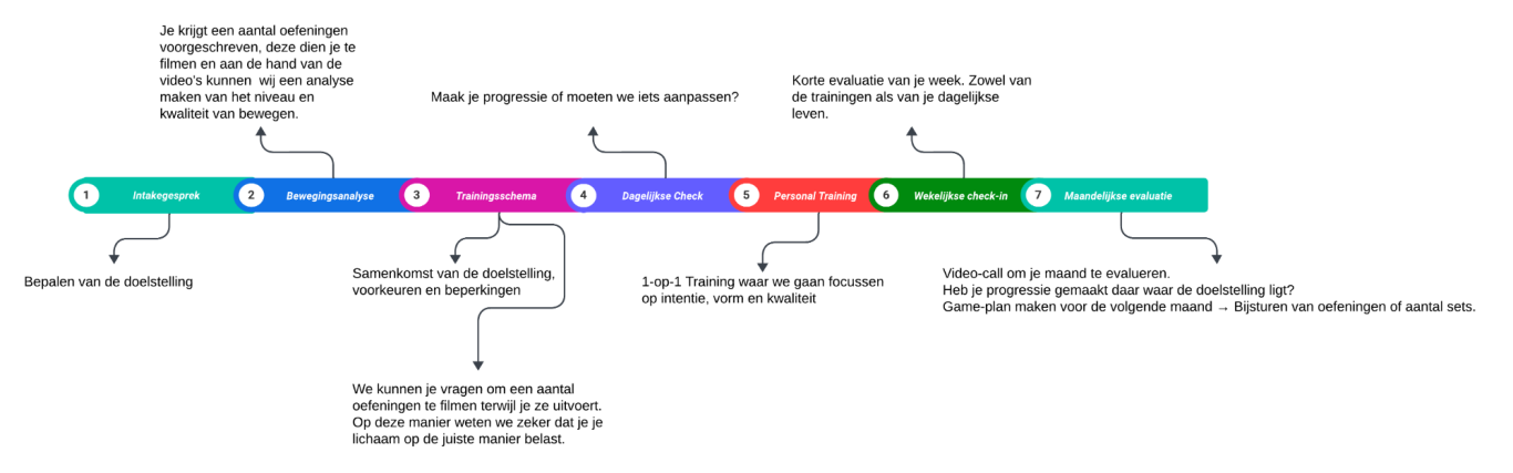 - Intakegesprek/Bewegingsanalyse = Niveaubepaling (Is deze oefening volledig nieuw voor jou? Dan beginnen we met de basis, we focussen op techniek en zorgen dat je technisch sterk in je schoenen staat.)